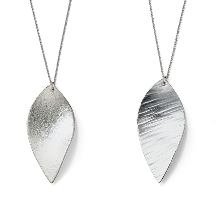 やわらかい金属である錫の特性を生かし、ペンダントトップにはゆるくカーブがつけられています。