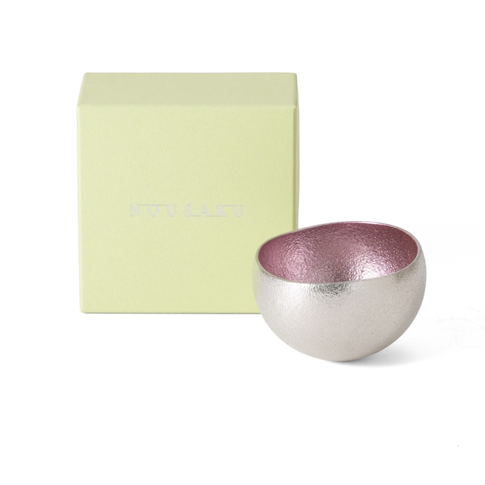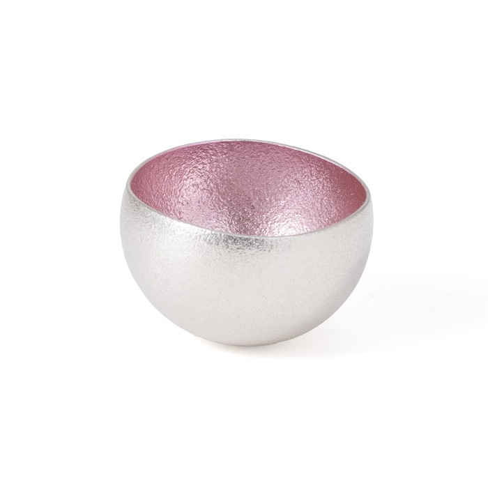 やわらかく光を反射する錫の性質を下地として生かし、素材の表情に合わせて淡桜色を重ねることで、内側からほのかに光るような、澄んだ発色を引き出しています。