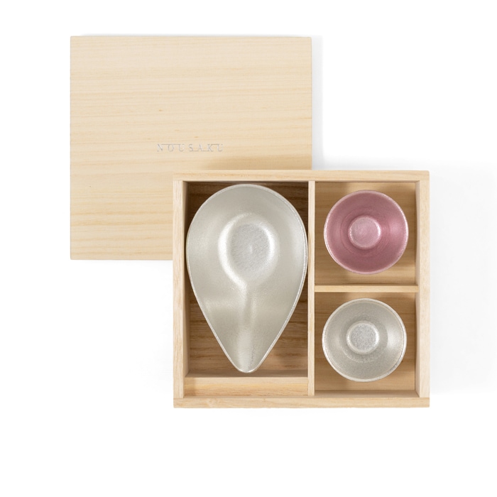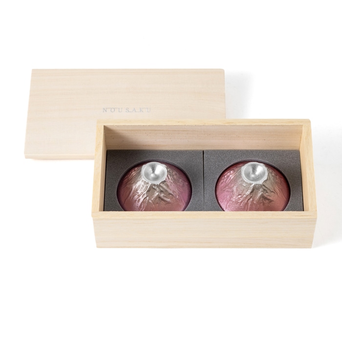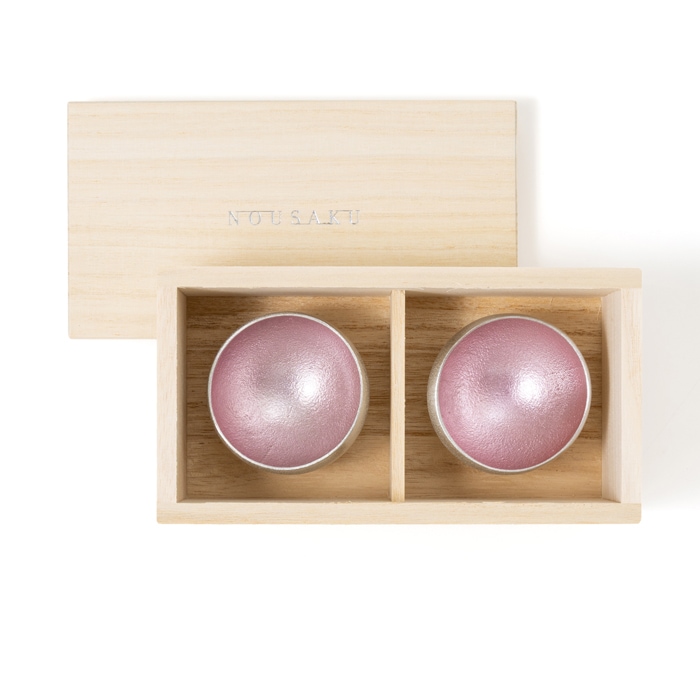 やわらかく光を反射する錫の性質を下地として生かし、素材の表情に合わせて淡桜色を重ねることで、内側からほのかに光るような、澄んだ発色を引き出しています。