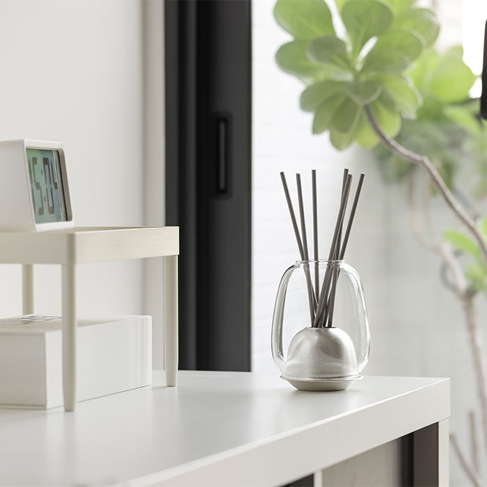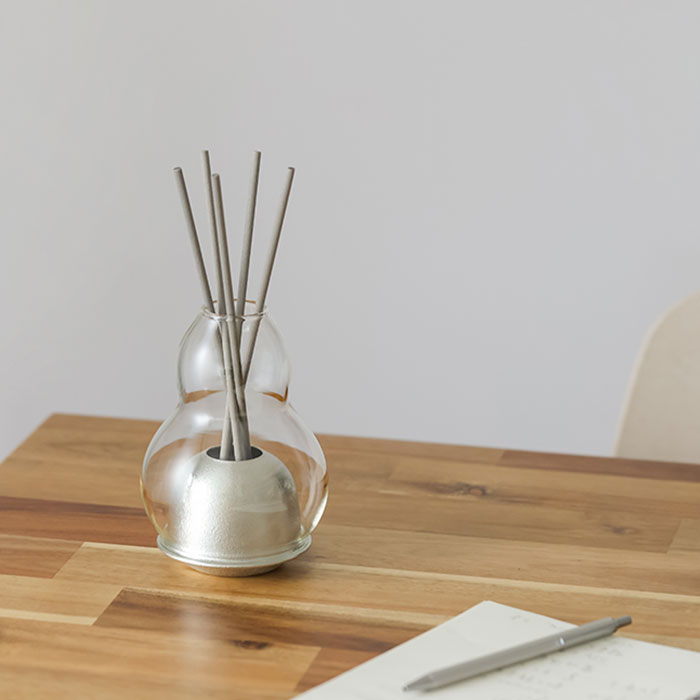 アロマリキッドを入れる錫100%の器とガラス製のカバーを組み合わせる美しいデザインは、インテリアとしても魅力的です。 リフレッシュ効果やリラックス効果が得られるアロマの香りを、リビングやベッドルームなどでお楽しみください。