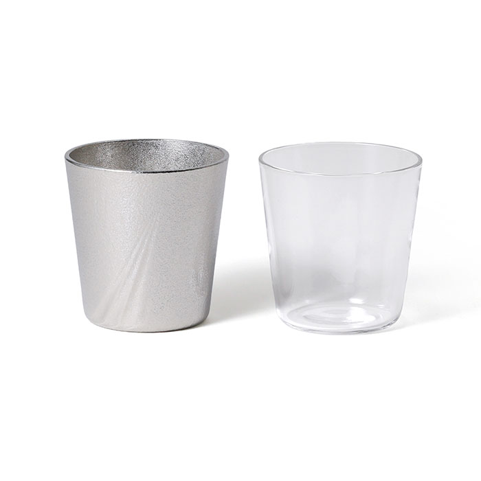 錫100%のぐい呑は、側面に入れたラインがアクセントになり遊び心のあるデザインに仕上げました。 ガラスの器もまた、能作のぐい呑同様、一つひとつ職人の手で作られ、素材の透明感が引き立つ仕上がりです。