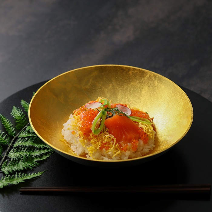 錫100%の深皿に、金沢の伝統工芸である金箔を贅沢にあしらいました。
