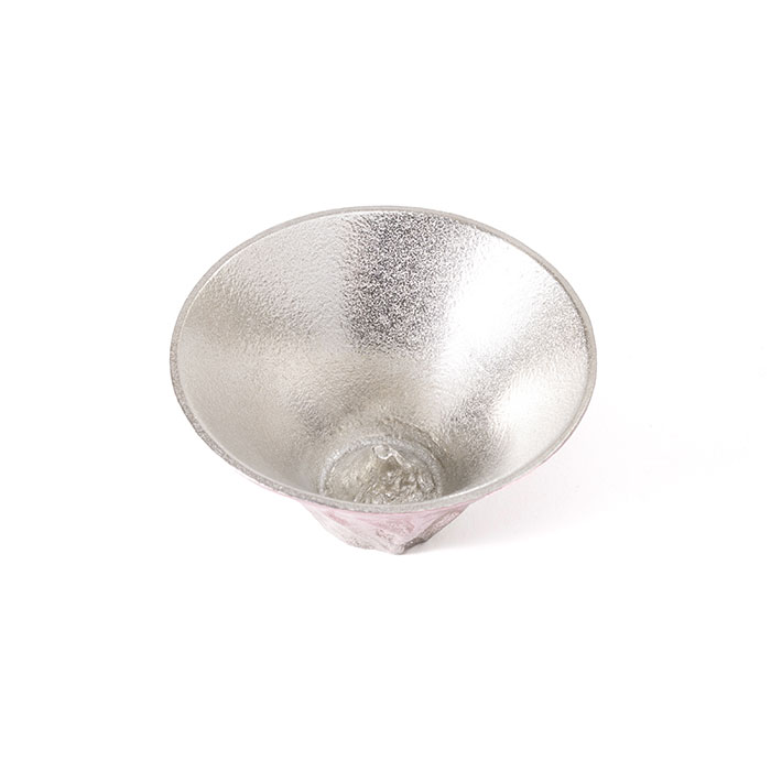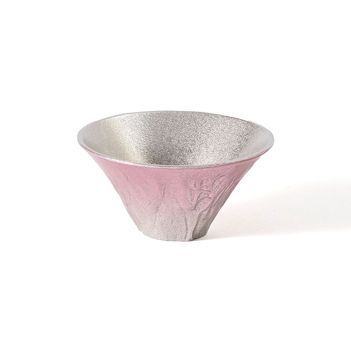淡桜色のグラデーションは、器の起伏や流れに沿って表情を変え、錫の光沢と重なり合いながら、奥行きのある佇まいを生み出します。