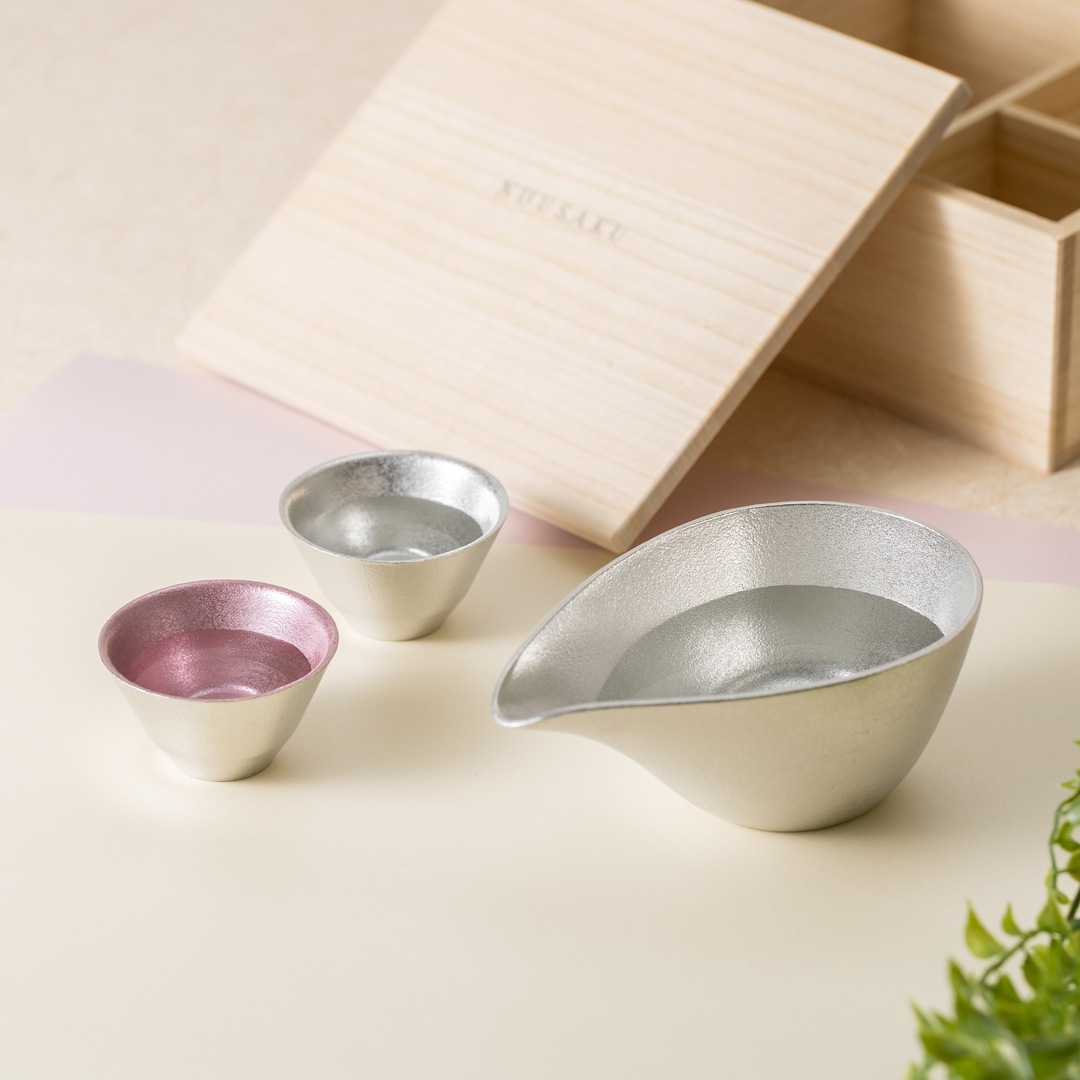喜器と並べたときにバランスがよい大きさの錫の片口に、錫そのものの表情を楽しめる盃と、淡桜色のやさしい発色をまとった盃を組み合わせた酒器3点セットです。